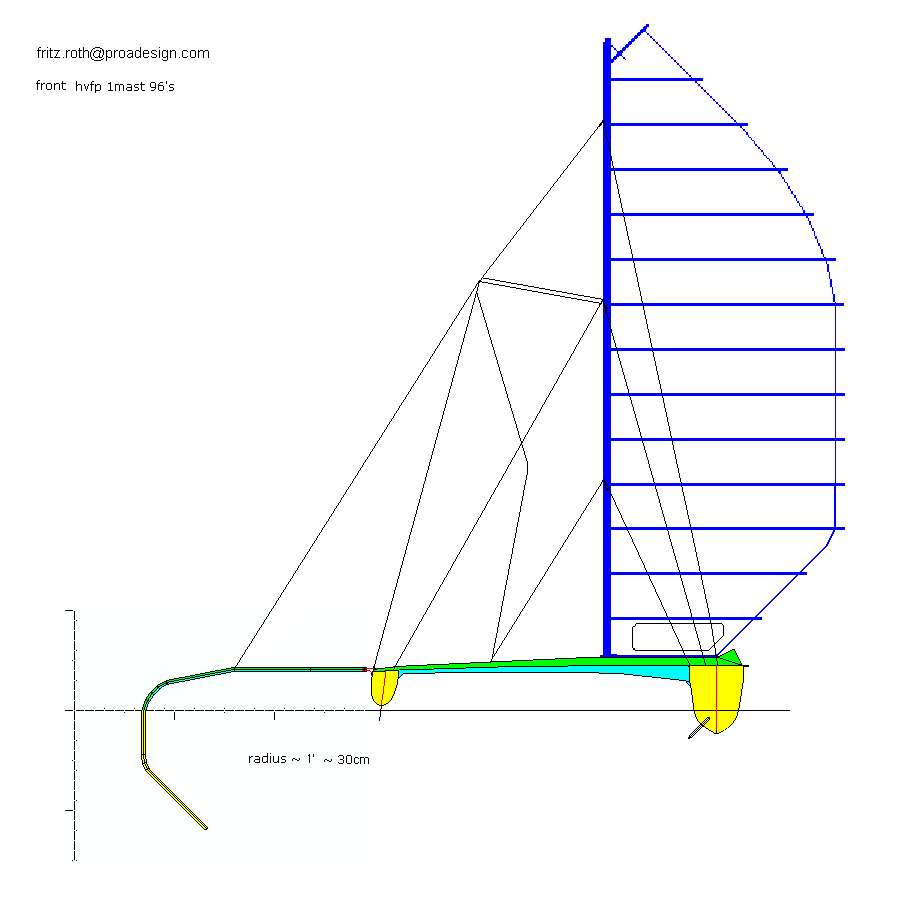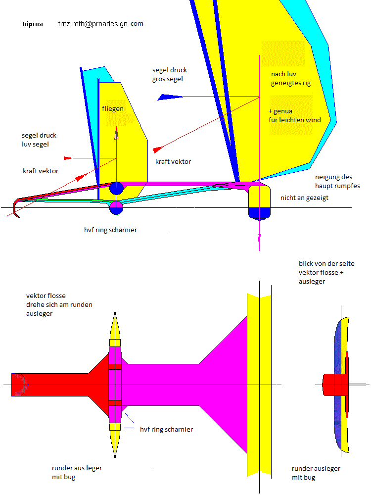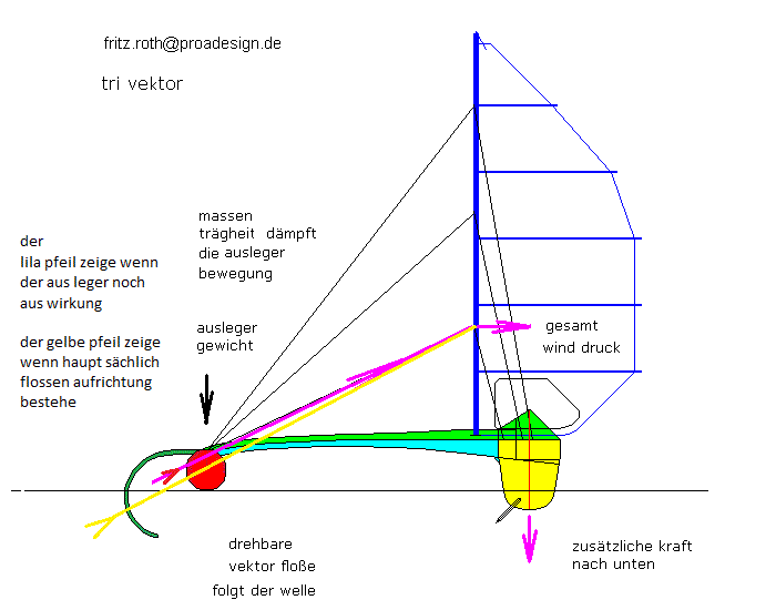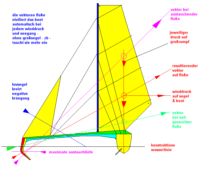 das rigg – flosse – steuerung - der mast ist 3 mal verstagt – allso 1/3 –2/3 – 3/3 so daß auch der winddruck von der falschen seite aufgenommen - wie man aus dieser lage heraussegelt - kommt auf das jeweilige boot - die segel an – diese funktionieren dabei immer rückwärts - generell sollten alle segel dicht sein und dabei aufschießen - bis man auf der richtigen seite landet – dort bleiben ! oder mit dem groß immer mehr vor den wind gehen bis – man dort ist - dieses manöver sollte geübt werden unter leichten bedingungen damit man nicht überraschend in dieser lage steckt - die nut des großsegels ist querab in lee (4) so daß die strömung darüber immer glatt ist - etwa wie wenn beim normalen boot der mast drehbar aufgestellt - dieses segel geht ganz herunter bis zu deck - als strömunsabschluß - auch für mehr fläche und niedriger druckpunkt - die rollfolks sind miteinander verbunden via kontrolleine (2) das heißt - wenn man die eine dichtholt - rollt sich die andere automatisch auf - diese segel haben weniger fläche – weil dann das material dick und die handhabung bei starkwind einfach ist - sollte man mehr segelfläche anstreben kann ein leesegel gefahren oder am 2/3 stag ein leichtes großes rolli angebracht werden - aber diese boote laufen ja so leicht - daß wenig fläche notwendig für gute leistung – 10qm bei 10m - deshalb reicht die kleine folk generell sehr gut aus - das luvsegel ist auch nur etwa 1/4 des großsegels in fläche (3) bringt vortrieb ohne kränkung – kann auch ganz alleine bei starkwind gefahren werden - steuerung – durch 2 schlaufen bewegen die füße die entsprechenden ruder so – daß wenn man den fuß in die eine richtung bewegt - bewegt sich das boot auch in diese richtung - die asymetrische floße (6) bringt auftrieb und bei böen verhindert sie ein austauchen - weil die untere hälfte nach lee gewinkelt ist - bei brechenden wellen ist automatischer wasserbalast (9) möglich - storm ! - bei storm läßt man wenn man sie nicht irgendwie braucht die rollfolks am besten aufgerollt und fährt mit luvsegel & lose gefahrenem groß - dadurch ist dann die geschwinigkeit etwas reduziert der druck auf mast & großsegel auch - vorallem steuert die sache dann sehr leicht von alleine ausser vor dem wind mit dem boot surfen die welle runter - mit normalem groß & luvsegel kann man so bis 8 bft fahren - darüber hinaus habe ich noch keine erfahrung will es auch mit so einem kleinen (10m) nicht probieren - ein stormgroß – die zwar die gleiche höhe hat – aber nur die halbe fläche - hat sich bei tests gut bewährt - man kann mit ihm ganz alleine fahren (4qm = 10m) sogar gut höhelaufen – aufkreuzen – mit diesem segel auf einem größeren boot müßte man dann windstärke 10 bft schaffen können - querab und vor dem wind noch mehr - beim ankern in storm kommt einem die geringe fläche zugute die wind & wellen entgegensteht - ein10m boot braucht bis 10 bft eine 6mm leine – 2,5kg anker! Man kann es kaum gleuben –aber es hat gehalten die bewegungen bei storm – überhaupt – sind sehr angenehm - kein stampfen – natülich kein rollen – die niedrige höhe - die große lüa & büa hat auch hier ihren vorteil - die gewinkelte floße – verhindert nicht nur ihr austauchen durch die windkräfte der segel & rigg – wenn eine böe mit 12 bft seitlich trifft - ohne segel - kann man praktisch keine änderung bemerken – auch bei einer brechenden welle – ist die sache sicher ......