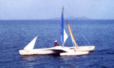 wenden – halsen - die theoretische art auf die andere richtung ....... in der praxis sieht die sache besser aus – wenn bei der wende – man auf dem jetzigen schlag – luv & groß los läßt - das groß auf der anderen seite zügig immer dichter holt - dann sobald fahrt aufgenommen in der anderen richtung und etwa querab vom wind rollt man das rolli auf - dann wenn am wind das andere ab & dicht – luvsegel dicht - mit dieser art nimmt man schneller fahrt auf und verliert durch das schnelle drehen der „hinteren" folk weniger höhe - beim halsen rollt man die folk schon vorher auf dreht in den wind - läßt das luv lose - holt die „hintere" folk dicht – das luvsegel auch - man kann dabei das groß lassen wie es steht bis vor dem wind - die andere klemme schon belegen vorher - dabei kann natürlich mit dem rudern immer die entsprechende richtungsänderung unterstützt werden - auch schneller gestoppt werden indem man sie querstellt - auf station gehen – ankern – anlanden etc. - wenn das jeweilige rolli aufgerollt das luv - groß lose - wird sich das boot querlegen - dann kann die bodenbeschaffenheit geprüft – gepeilt werden - wenn dann das luv etwas dicht geholt - bewegt sich der ausleger in die andere richtung - wenn gleichzeitig das groß dicht gemacht - bewegt sich der großrumpf entsprechend - man kann also drehen oder in jede richtung gehen - wohin man immer auch will – ohne folk – das luv muß nur immer etwas dichter sein als das groß - am ankerplatz angekommen – läßt man ihn los – bewegt sich entsprechend – läßt ihn eingraben – belegt die leine - checked ob er auch hält – alles unter segel & mit ihnen - falls etwas schief gehen sollte – anker hoch und abfahren - alles vom cockpit aus – auch alleine - mit der gleichen methode – kann auch vorsichtig an einem strand angelandet - über eine sandbar navigiert - vom strand abgefahren werden - dabei kann dann entsprechend gesteuert werden indem beide ruder etwas aus dem wasser gucken und das boot nicht auf sie fällt bei swell -